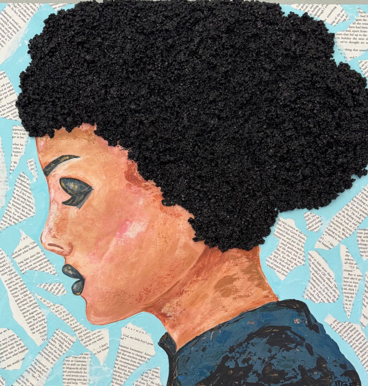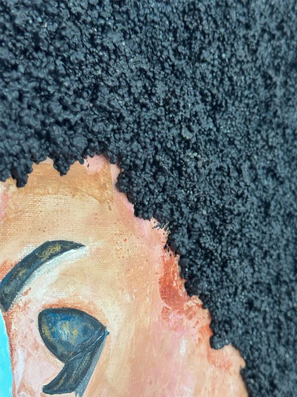 In dit schilderij van Mijanou Groenewoud staat de haardos centraal. Het volumineuze, driedimensionale haar vormt de blikvanger van het doek en trekt direct de aandacht. De combinatie van collagetechniek, structuur en verf maakt het werk gelaagd en krachtig.
